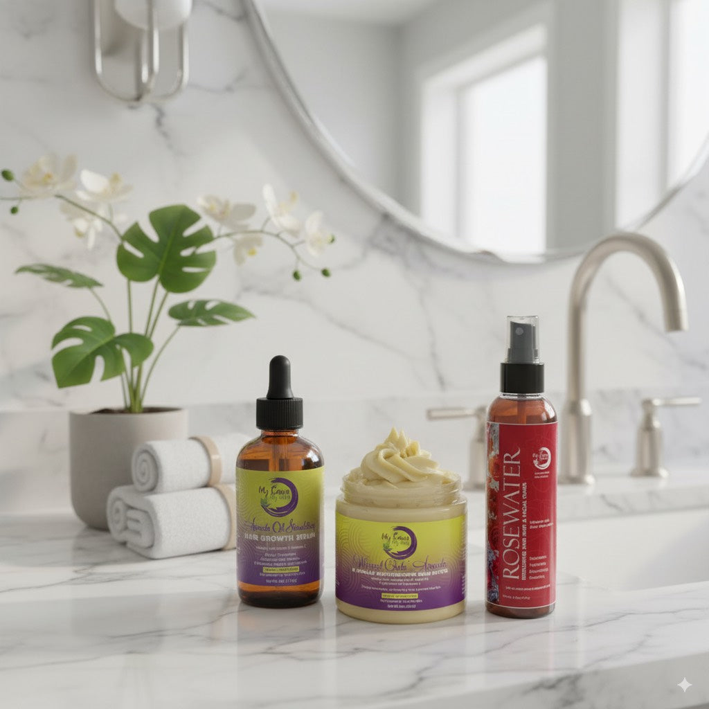Hydrate, stimulate, and seal, all in one powerhouse bundle. The Crown Revival Trio includes our best-selling Hair Growth Serum, ultra-rich Hair Butter, and refreshing Rose Water Spray. This 3-step combo is your crown’s new growth ritual.